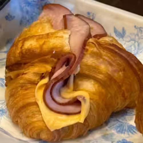 A buttery, flaky croissant filled with savory ham and melted cheese, baked to golden perfection for a warm and satisfying bite.