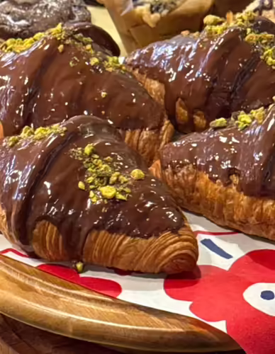 A flaky, buttery croissant filled with a rich pistachio and chocolate cream, topped with crunchy pistachio pieces for an added texture.