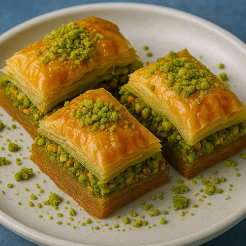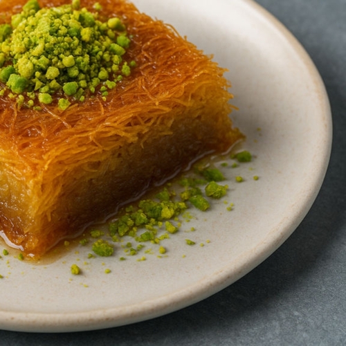 A beloved Turkish dessert made with finely shredded phyllo dough (kadayif), baked to golden perfection, and soaked in fragrant syrup. This crispy, sweet pastry is layered or rolled with crushed pistachios, creating a rich contrast of textures and flavors. Best served warm and garnished with a generous sprinkle of vibrant green pistachios.