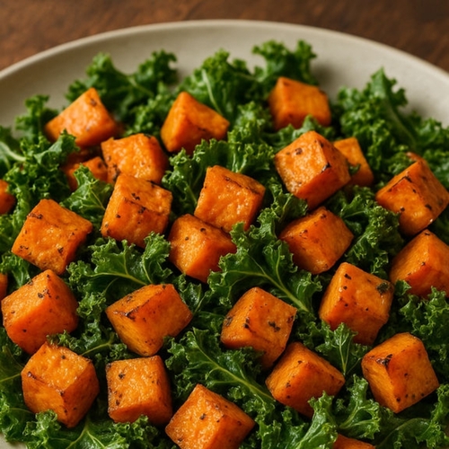 Roasted sweet potato salad with fresh kale and pomegranate molasses.