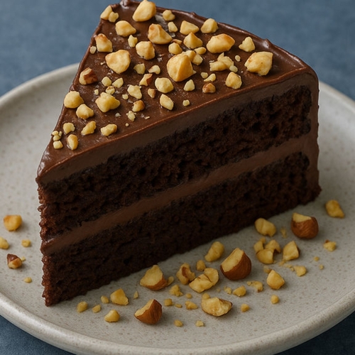 Yummy and crunchy hazelnut cake with chocolate flavor. Served cold.