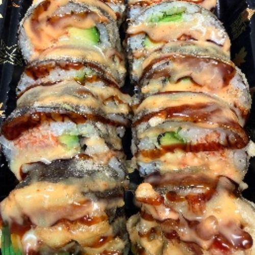 Deep fried roll with tuna, salmon, yellowtail, special sauce,and mango on the top.
