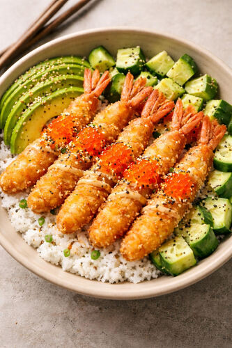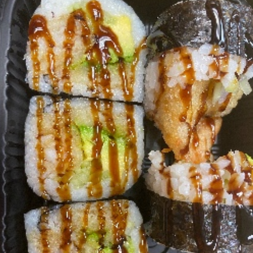 5pc Shrimp tempura, cucumber, avocado, massago, with eel sauce and spicy mayo