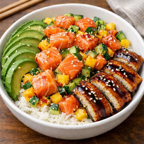 Salmon, mango, cucumber, avocado, sweet hot sauce, eel, sesame seeds