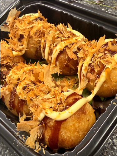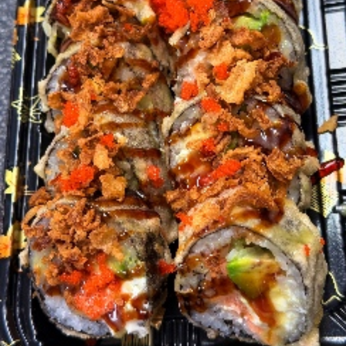 Deep fried roll with smoked salmon, cream cheese, avocado, wasabi mayo, eel sauce, tobiko and fried onion on the top.