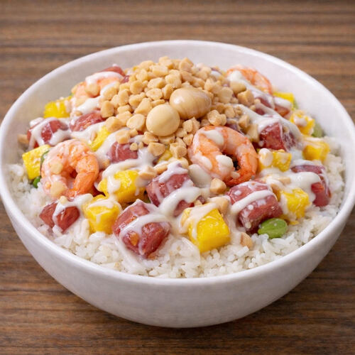 Shrimp tuna, mango, pinapple, macademia nuts, coconut cream