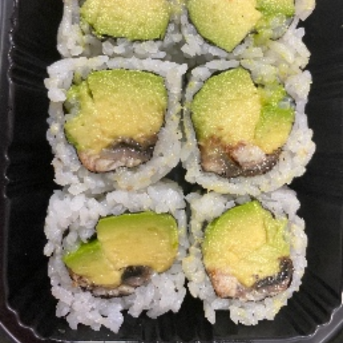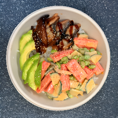Krab meat, cucumber, edamame, spicy mayo, avocado, eel, sesame seeds