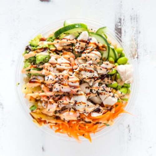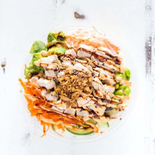 Chicken, edamame, carrots, avocado, green onion, cucumber, crab stick (contains gluten), OG sauce, sweet soy (contains gluten), and sriracha aioli.