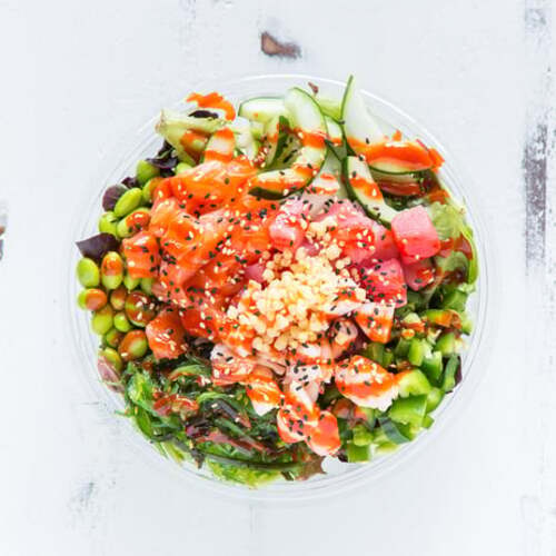 Salmon, avocado, edamame, cucumber, masago (contains gluten), OG sauce (contains gluten), and sriracha aioli.