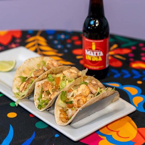 3 Tacos of baby shrimp with lettuce, pico de gallo, and chipotle mayo. Flour tortillas.