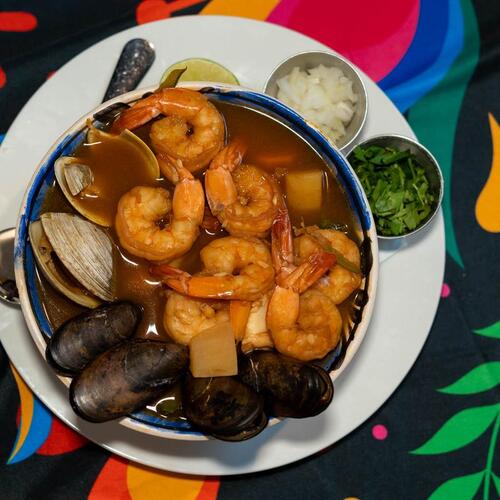 A mix of seafood and vegetables in red broth served with tortillas, onion, cilantro, and dry chile.
