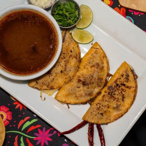 A Mexican dish comprising three folded corn tortillas, filled with birria-style cooked beef with melted cheese and served with a side of consome for dipping