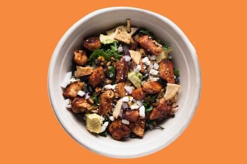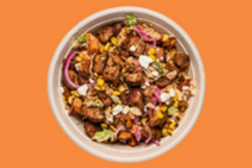 Brown rice with roasted sweet potatoes, charred corn, feta, pita chips, lime-pickled onions, and avocado. Lemon Tahini & Caesar dressing with a dash of Frank's Red Hot and 1.5 servings of Grilled Chicken!
