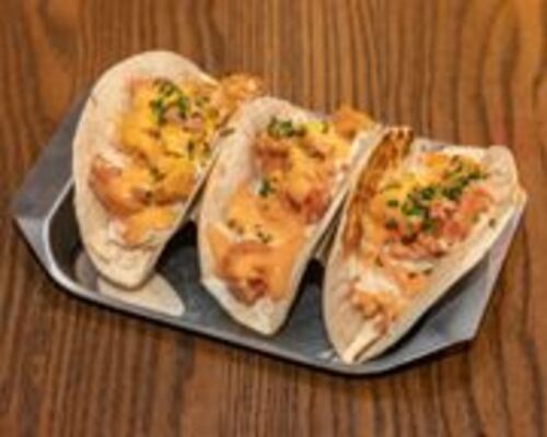 Southern Shrimp Tacos, Crispy shrimp in bang bang sauce, topped with slaw and sriracha aioli