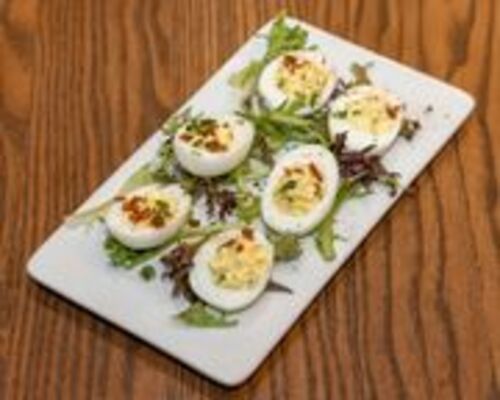Country Deviled Eggs. Topped with bacon, Sweet Relish & House Sauce