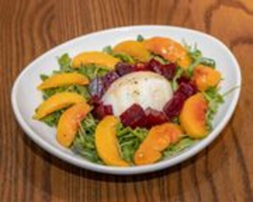 Beet and Arugula Salad, Arugula, Beets, burrata cheese, preline pecans, sliced peaches with a peach vinaigrette