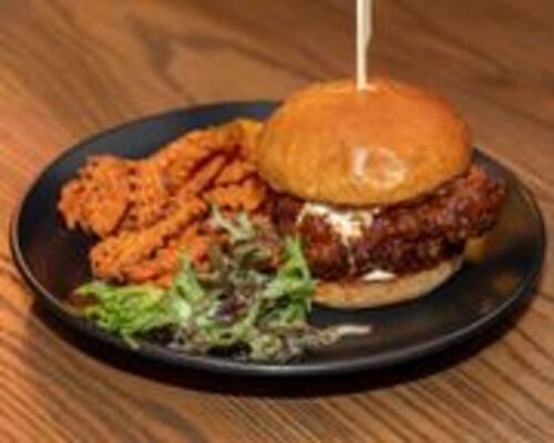 Fried chicken, house Nashville hot sauce, pickles,ranch, brioche bun. Choice of One Side