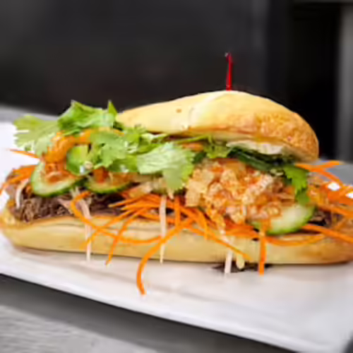 Pickled radishes and carrots, cucumber, kimchi, jalapeños, Brie, cilantro, yum yum sauce, baked Pan de Baston
