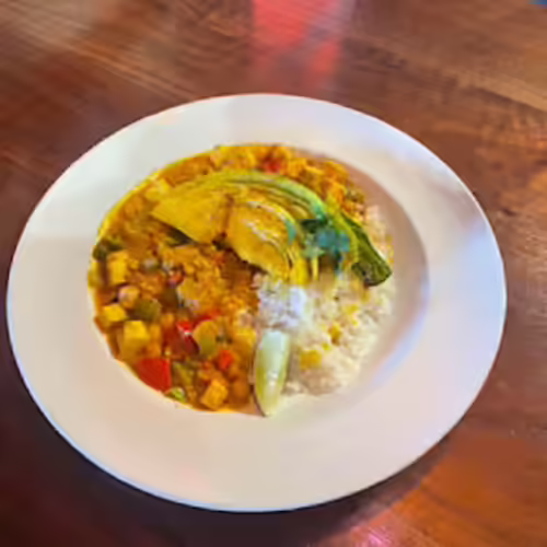 Tofu, bell peppers, chickpeas, onions, jasmine rice, yellow curry broth
