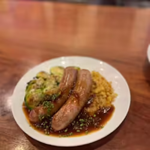 Grilled bratwurst, banger sausage, apple-butternut squash stuffing, roasted cheddar Brussels sprouts, brown onion gravy
