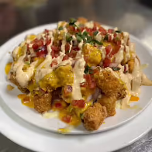 Tater tots, hot pepper cheese sauce, pico de gallo, cheddar-jack, chipotle ranch, scallions