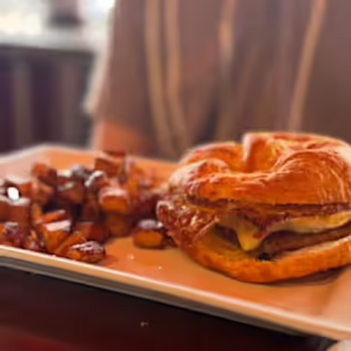 Maple sausage patty, two fried eggs, white cheddar, croissant, home fries