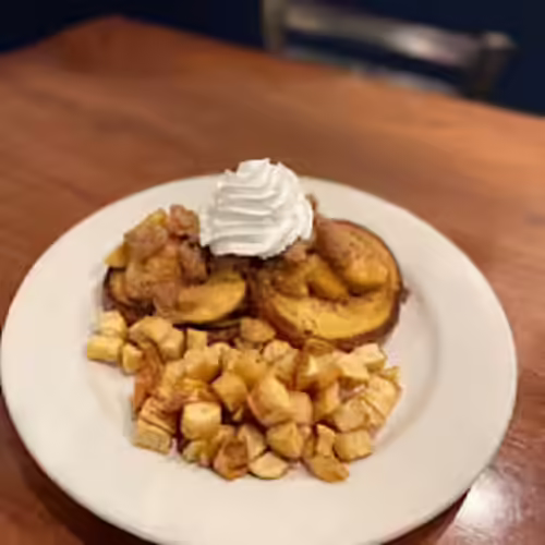 Cinnamon swirl bread cooked in crème brûlée custard, apple pie filling, streusel topping, whipped cream, home fries