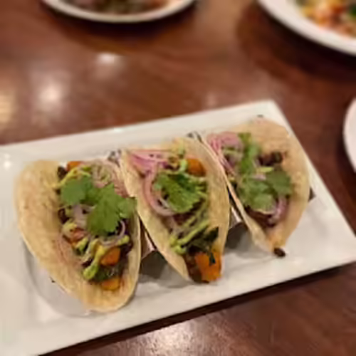 Taco-seasoned butternut squash, poblano peppers, chipotle black beans, pickled red onions, avocado sauce, cilantro
