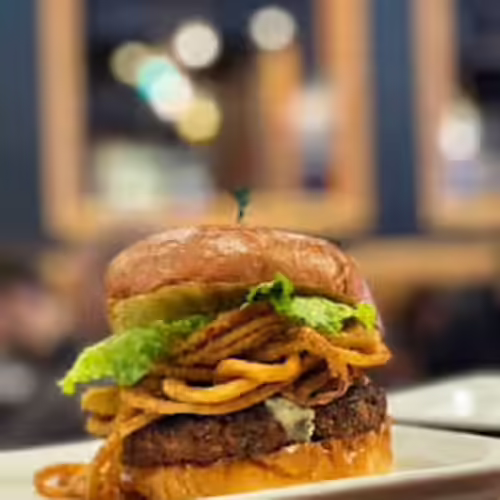 Angus 8oz. beef patty, aged cheddar, red wine-braised mushrooms, arugula, Stafford bacon, crispy onion strings, roasted garlic steakhouse aioli