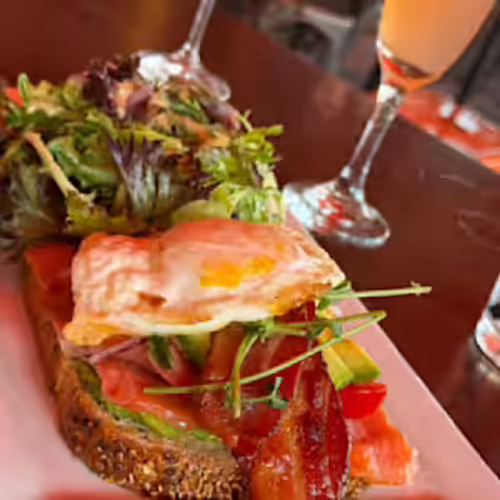 Smoked salmon, avocado, sprouts, bacon, cherry tomatoes, red onions, hard-boiled egg, wheat toast, side of field greens with house vinaigrette