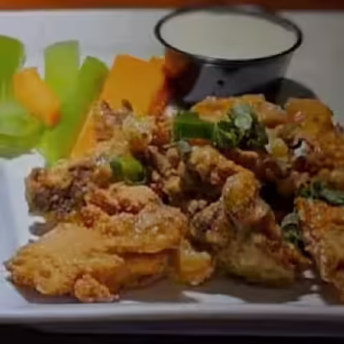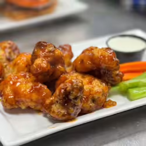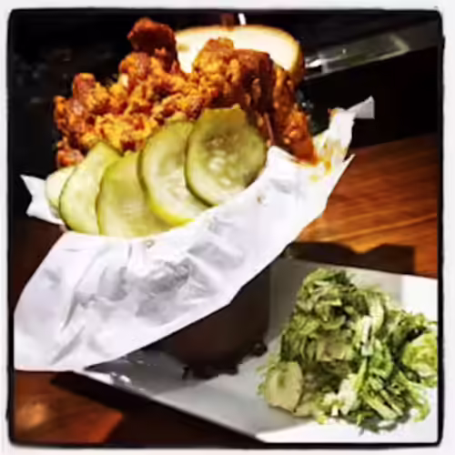 House-breaded chicken tenders tossed in chili pepper butter, white bread, house-made pickle chips