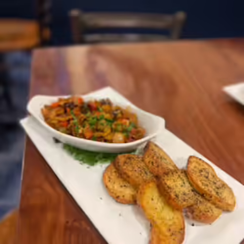 Golden raisins, capers, onions, bell peppers, tomatoes, toasted herb crostini