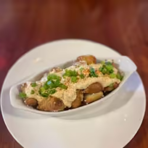 Yukon Gold fries, cheddar-jack, pickled jalapeños and onions, bacon crumbles, sour cream, scallions