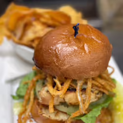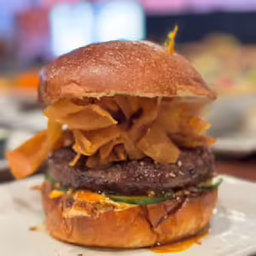 Swiss cheese, Stafford bacon, full sour pickle slices, onion straws, whipped hot honey drizzle, brioche bun