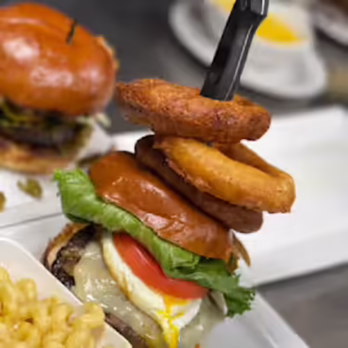7oz. beef patty, white cheddar, bacon, leaf lettuce, sliced tomato, caramelized onions, sunny-side up cage-free egg, fried onion rings, secret sauce