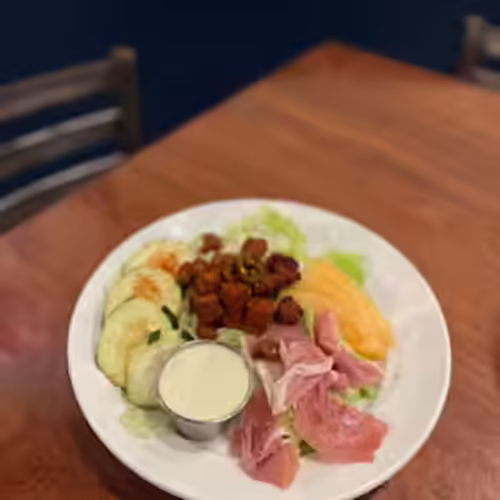 Cantaloupe, carrots, cucumbers, blue cheese crumbles, candied jalapeños, prosciutto, bacon lardons, iceberg lettuce, jalapeño bacon ranch dressing