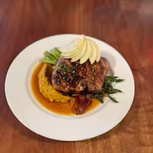 Roasted winter squash purée, crispy fingerling potatoes, bacon green beans, apple-pork demi-glace