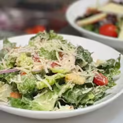 Cherry tomatoes, red onions, garlic butter croutons, shaved Parmesan, romaine lettuce, Caesar dressing