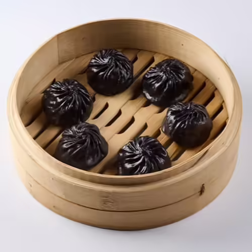 Six soup dumplings filled with savory pork, truffle (umami flavor), and rich broth.