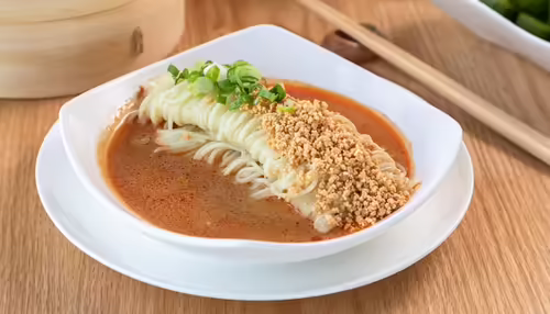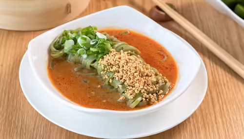 Tender noodles topped with a rich sesame sauce, garnished with chopped green onions and crushed peanuts.
