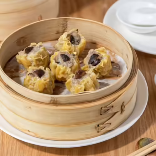 Delicate dumplings filled with seasoned pork and shrimp, topped with a slice of mushroom.