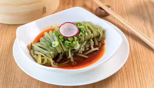Delicate dumplings filled with a medley of fresh vegetables, wrapped in vibrant green dough. Six pieces per serving.