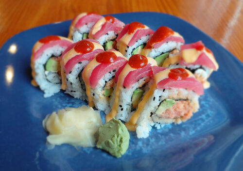 Spicy tuna, cream cheese, avocado, topped with tuna