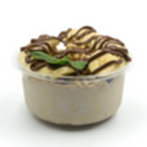 Banana blend (contains banana, honey, and almond milk) with vanilla protein topped with blueberry flax granola, banana, mint, and Nutella®