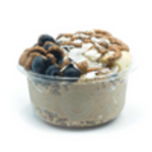 Booster blend (contains banana, peanut butter, vanilla protein, flax oil, spirulina and cashew milk) topped with blueberry flax granola, banana, chia seeds, and peanut butter