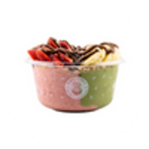 Half Matcha Base (Playa Coconut® Base, banana, matcha & coconut milk), Half Stupid Cupid Base (strawberry, banana & coconut milk) topped with blueberry flax granola, strawberry, banana, cacao nibs & Nutella®