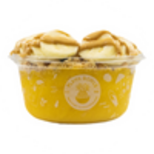 Playa Mango blended with vanilla protein topped with blueberry flax granola, banana and peanut butter