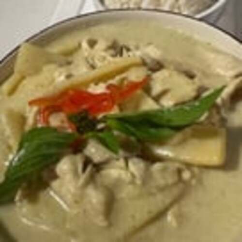 Gluten-free. Mild spicy. Creamy coconut milk, galanga, mushrooms, lemongrass, kaffir lime leaves.