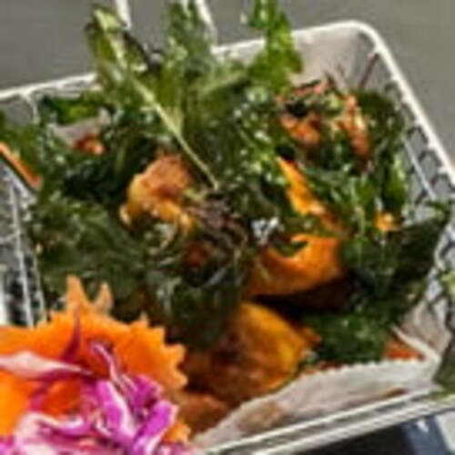 Mild spicy. Lightly breaded calamari, fresh chili, onions, scallions, sweet n' sour dip.