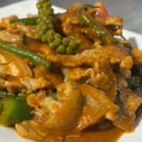 Medium spicy. Sliced pork, green peppercorns, baby corns, green beans, chili, sweet basil, touch of red curry.